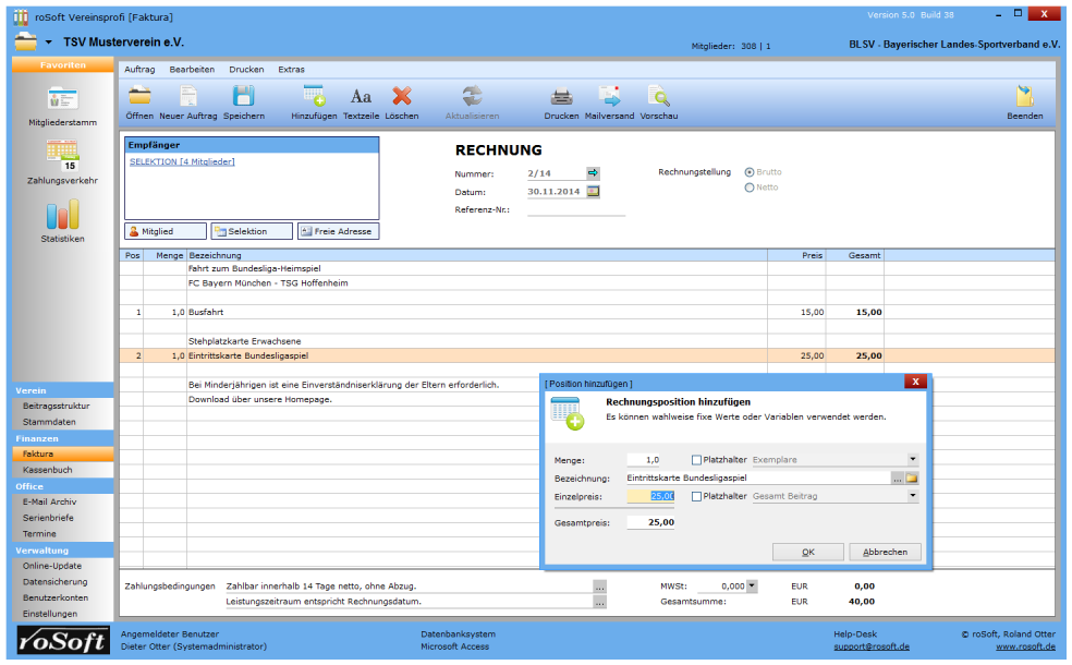 Sie bieten in ihrem Verein zum Beispiel Fahrten zu Fussball-Bundesliga-Spielen an und möchten die Kosten hierfür unabhängig vom Mitgliedsbeitrag vom jeweiligen Teilnehmer per Rechnung einziehen? Kein Problem: das Faktura-Modul